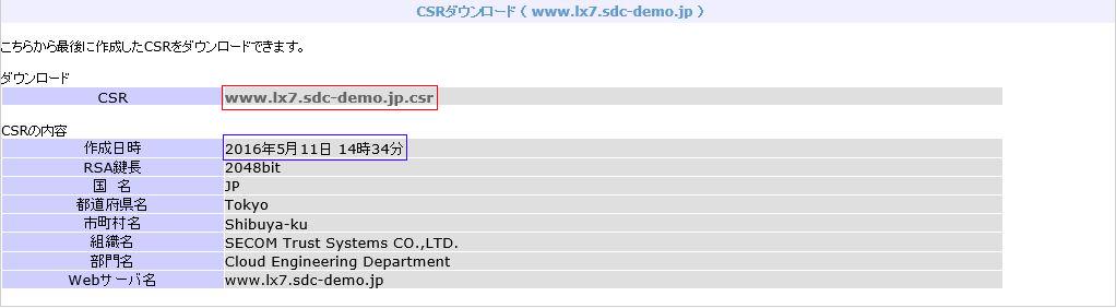 最後に作成したCSRはここからダウンロードすることができます。 赤枠のリンクからCSRをダウンロードしてください。