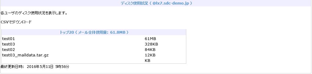 | ディスク使用率: | お客様利用可能領域のディスク使用率です。100%にならないように管理してください。 |